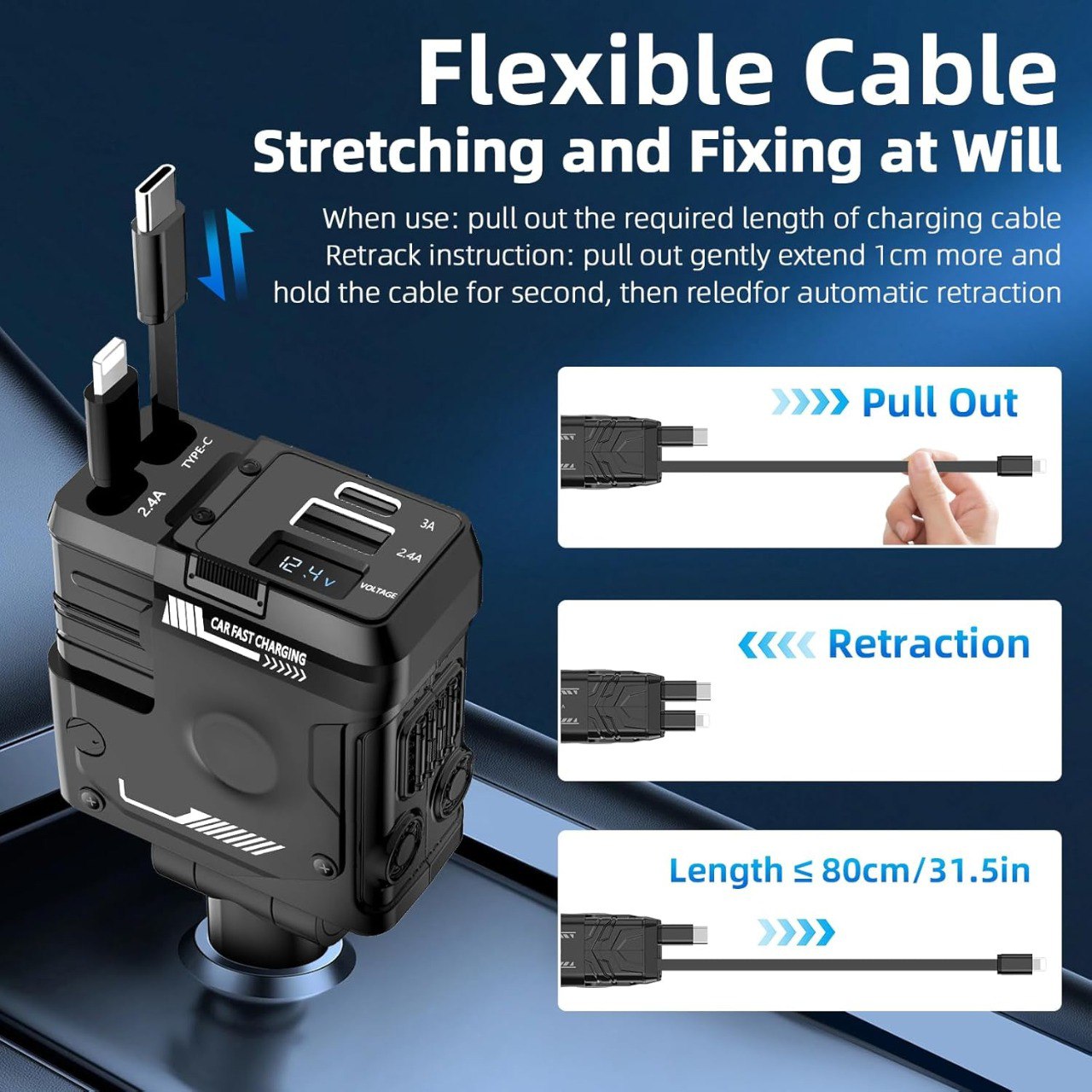 4-in-1 Retractable Car Charger, Dual USB Fast Charging Adapter with 31.5-Inch Cables, Compatible with iPhone 16/15/14/13/12 Pro Max, iPad, Pixel, and Other Devices